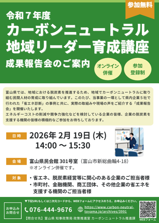 県では、地域のカーボンニュートラルを牽引する人材を育成するため「地域リーダー育成講座」を実施しています。このたび、県内企業5社で行われた「省エネ診断」の事例と共に、実際の取組みや現場の声をご紹介する報告会を下記のとおり開催しますので、お知らせします。