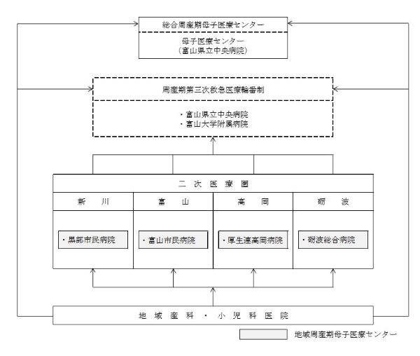 総合周産期母子医療センターである富山県立中央病院と、二次医療圏ごとの地域周産期母子医療センター、周産期医療の人材育成等を担う富山大学附属病院を中心に、県内の周産期医療体制を維持してきたところである。平成23年3月、富山医療圏において富山大学附属病院を新たに地域周産期母子医療センターとして認定するほか、富山赤十字病院と済生会高岡病院を、周産期母子医療センターを補完する「周産期母子医療センター連携病院」として新たに位置付け、関連施設の機能分担と相互連携の強化を図った。