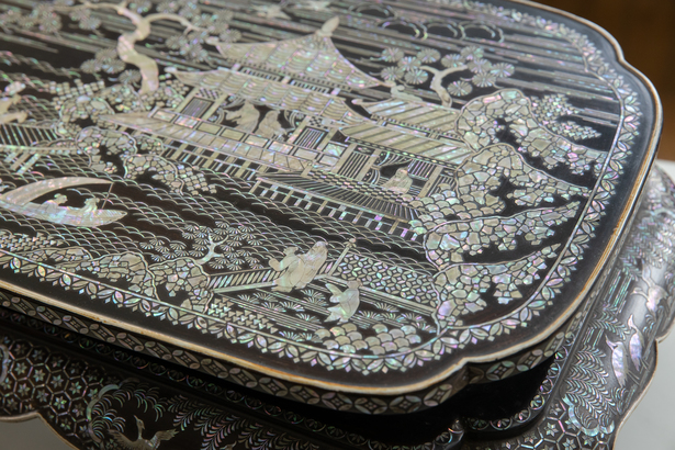 異種の木を嵌め込んでその色の違いから絵を浮かび上がらせる技法、木象嵌。古くは正倉院宝物にもこの技が見られます。富山木象嵌は明治40(1907)年、糸鋸(いとのこ)ミシンを使用した近代象嵌技術の第一人者である小田原の白川洗石に、中島杢堂が弟子入りし、技術を持ち帰ったのが始まりです。額装品やテーブル、建具など従来作られていたものだけでなく、茶器や照明、看板など、技術を用いた新たなものづくりが始まっています。