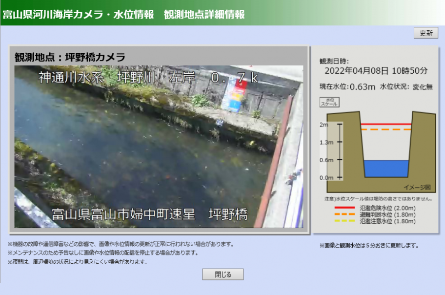 注1)機器の故障や通信障害などの影響で、画像や水位情報の更新が正常に行われない場合があります。