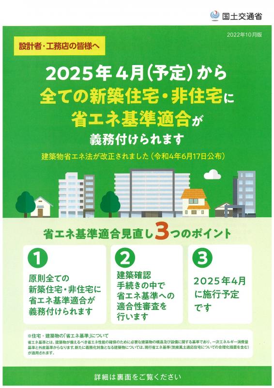 令和7年(2025年)4月(予定)から省エネ基準の適合義務化・4号特例の改正など、確認申請に関わる手続きが見直されますのでご注意下さい。