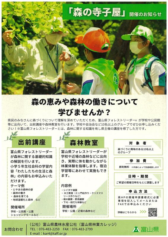 トップページ > 県土づくり > 森林・河川 > 森林・緑化 > とやまの森づくりホームページ「水と緑の森づくり事業」 > とやまの森づくり普及啓発推進事業(森の寺子屋)
