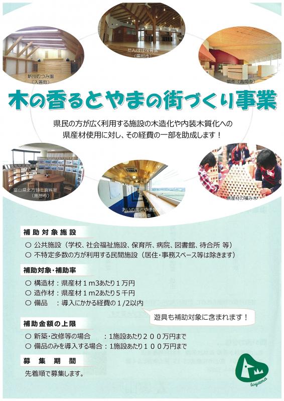 トップページ > 県土づくり > 森林・河川 > 森林・緑化 > とやまの森づくりホームページ「水と緑の森づくり事業」 > 県産材利用促進事業