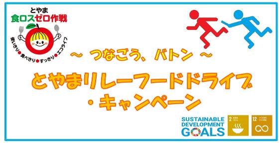 県では、「フードドライブ」について、県民の認知度の向上、取組みの浸透・拡大を図るため、県内全域で「とやまリレーフードドライブ・キャンペーン」を実施しています。