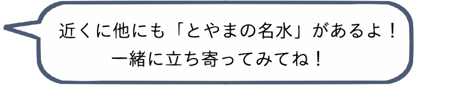 地元地域住民はもちろん近隣市町村からも多くの人が霊水として、水を汲みに訪れています。付近一帯は、とやま森林浴の森に指定され、自然観察学習の場としても利用されています。