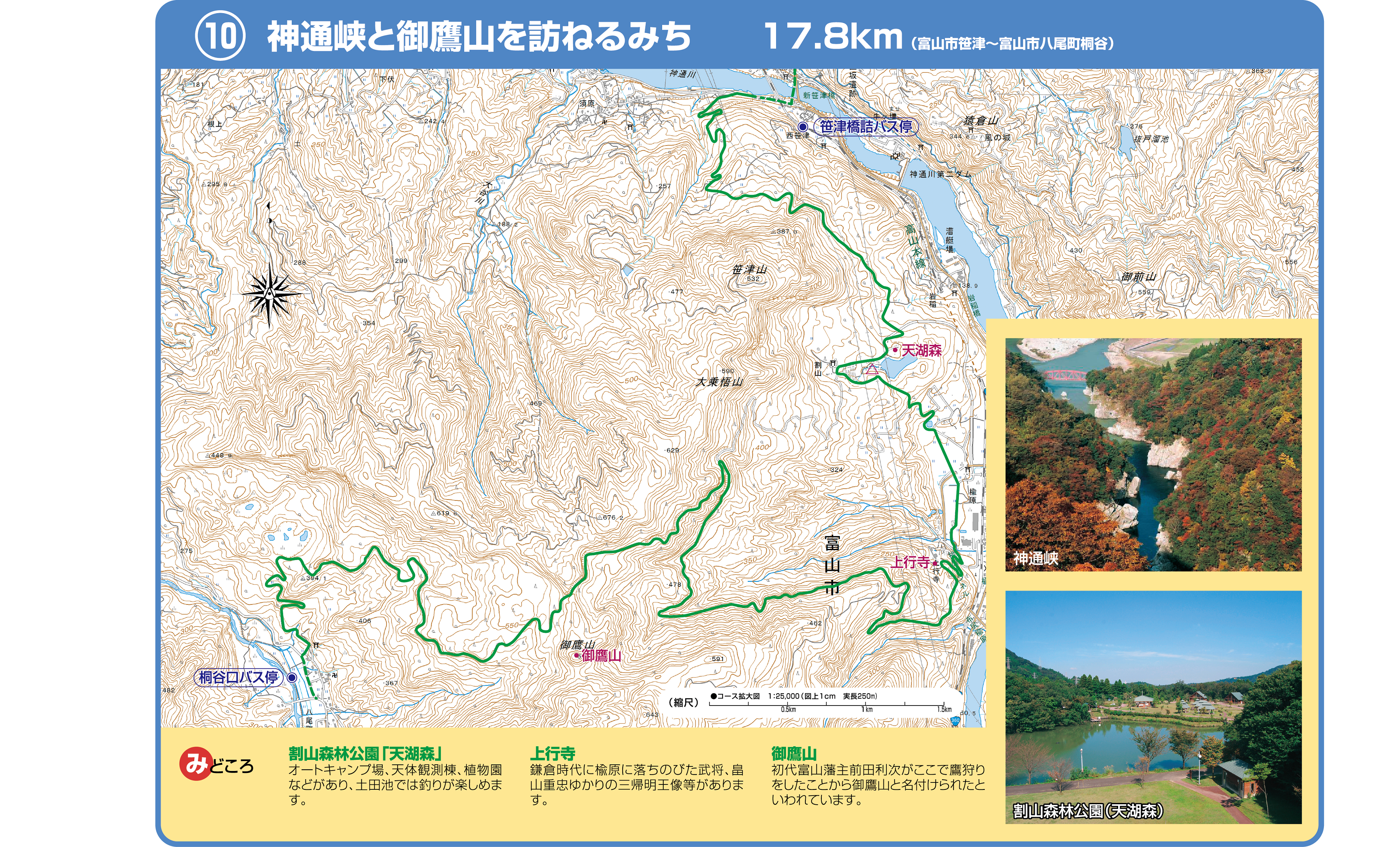 | 神通峡と御鷹山を訪ねるみち | 17.8 | 富山市西笹津 | 富山市八尾町桐谷 | 天湖森、上行寺、御鷹山 |