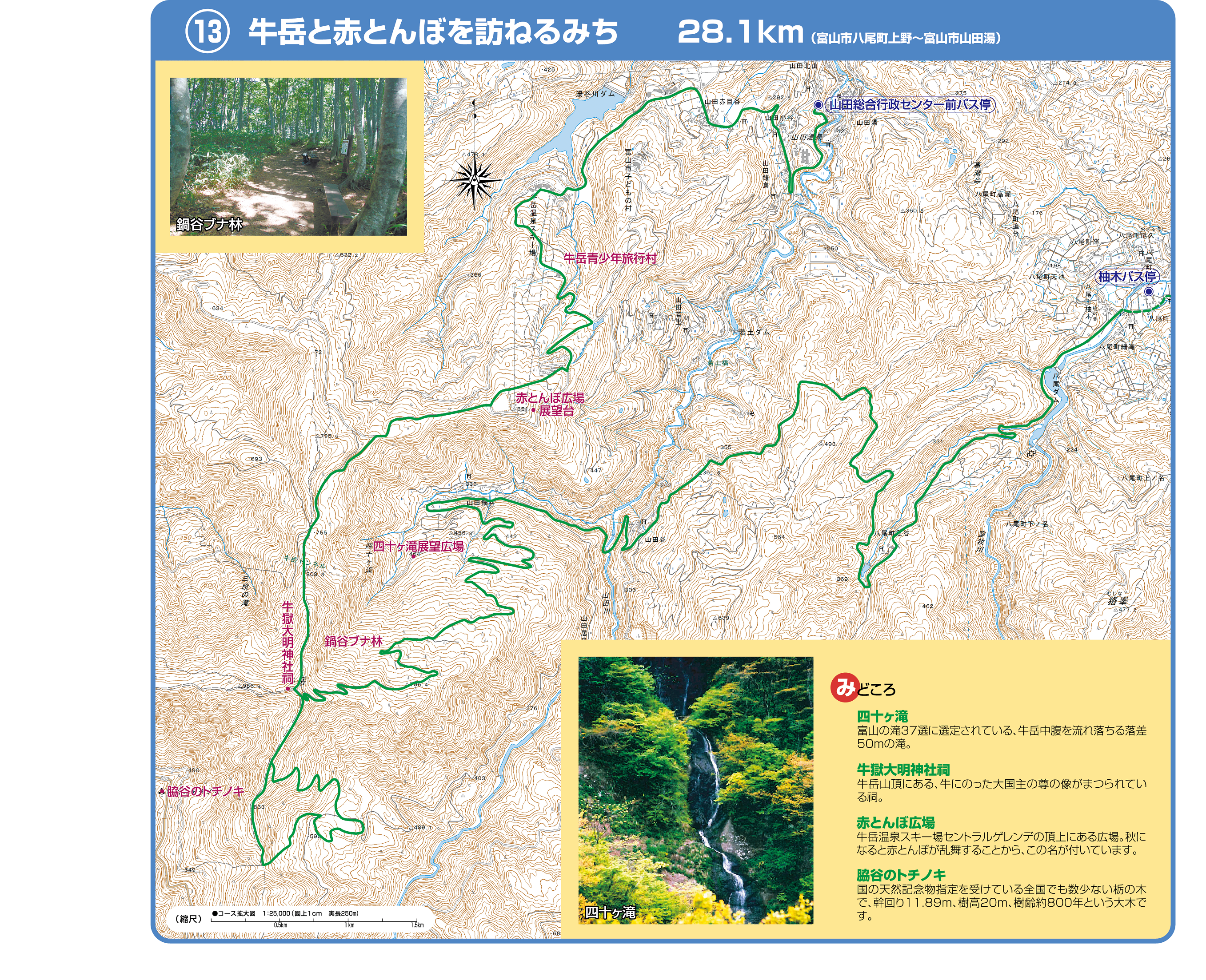 | 牛岳と赤とんぼを訪ねるみち | 28.1 | 富山市八尾町上野 | 富山市山田湯 | 四十ヶ滝、牛岳、鍋谷ブナ林、牛岳温泉 |