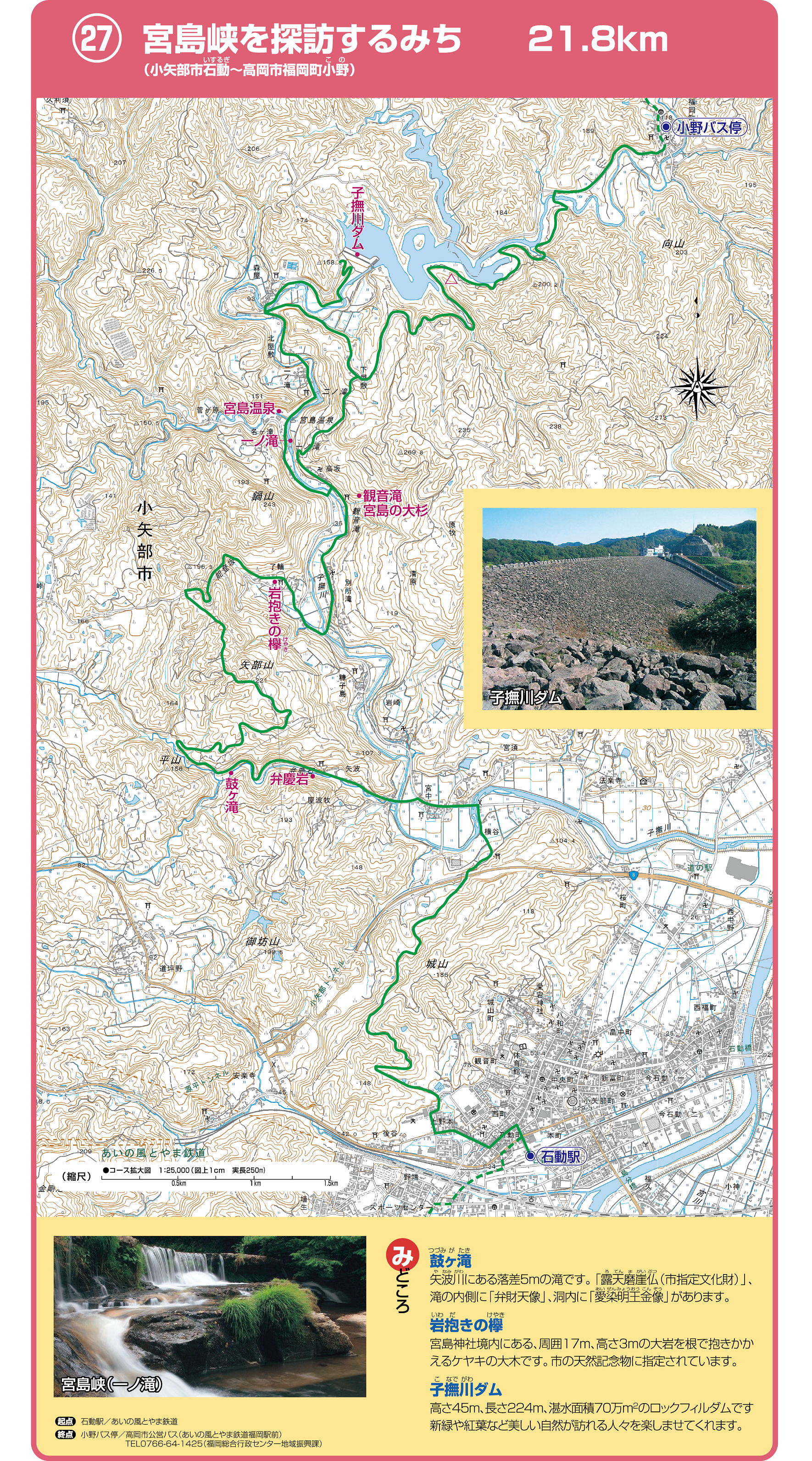 | 宮島峡を探訪するみち | 21.8 | 小矢部市石動 | 高岡市福岡町小野 | 鼓ヶ滝、宮島の大杉、一の滝、子撫川ダム |