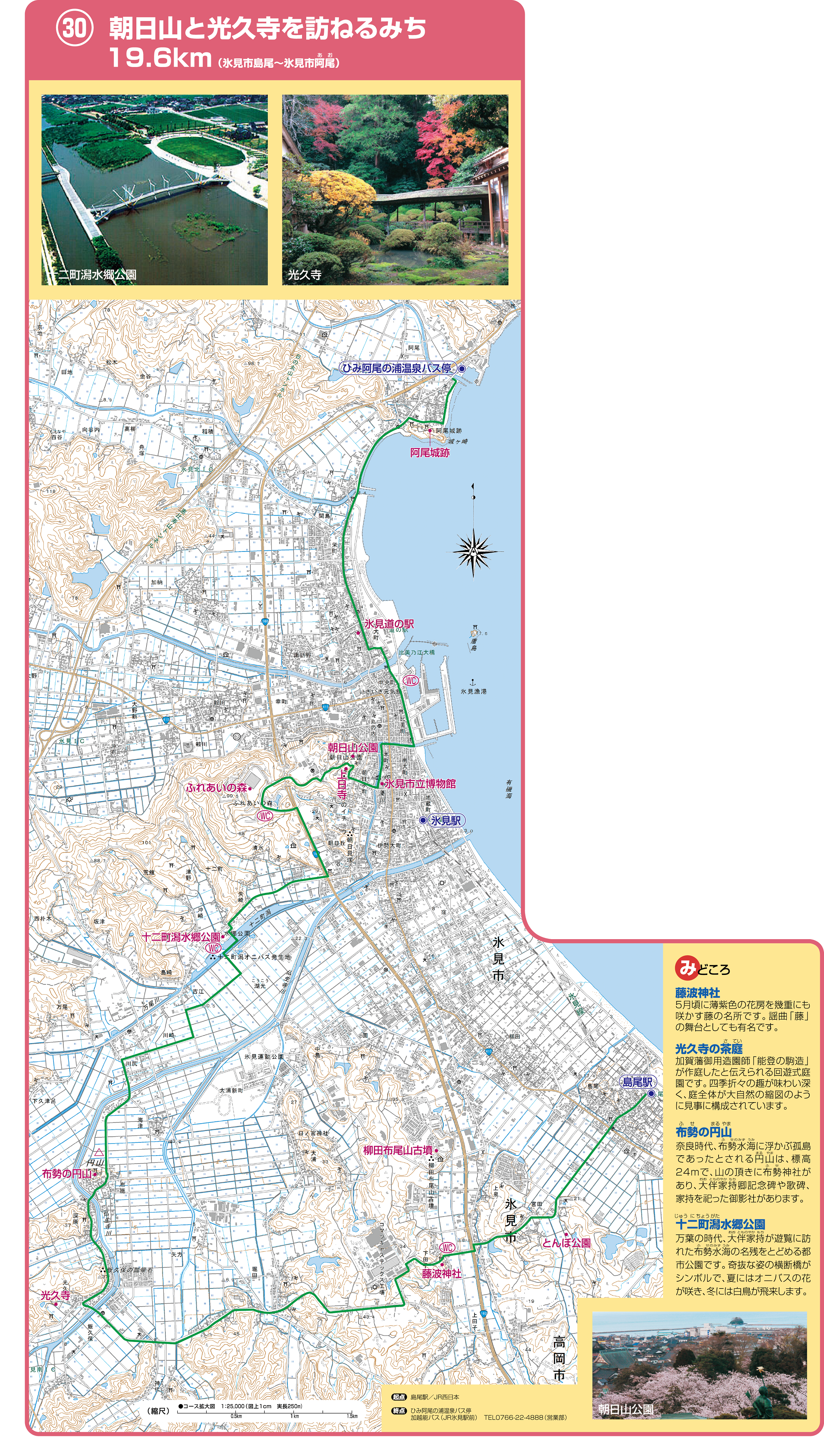 | 朝日山と光久寺を訪ねるみち | 19.6 | 氷見市島尾 | 氷見市阿尾 | 光久寺の茶庭、布勢の円山、十二町潟水郷公園、阿尾城跡 |
