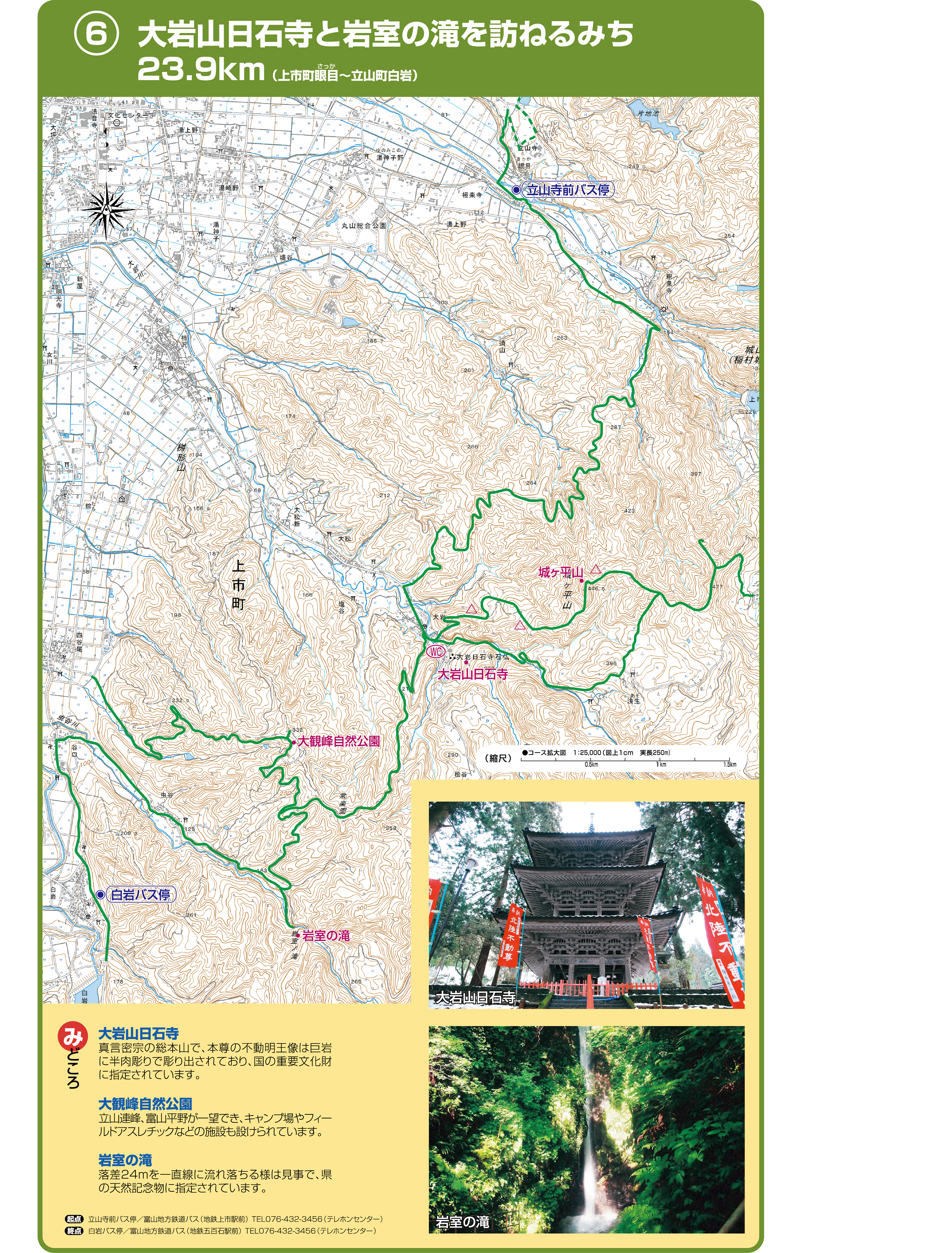 | 大岩山日石寺と岩室の滝を訪ねるみち | 23.9 | 上市町眼目 | 立山町白岩 | 大岩山日石寺、大観峰自然公園、岩室の滝 |