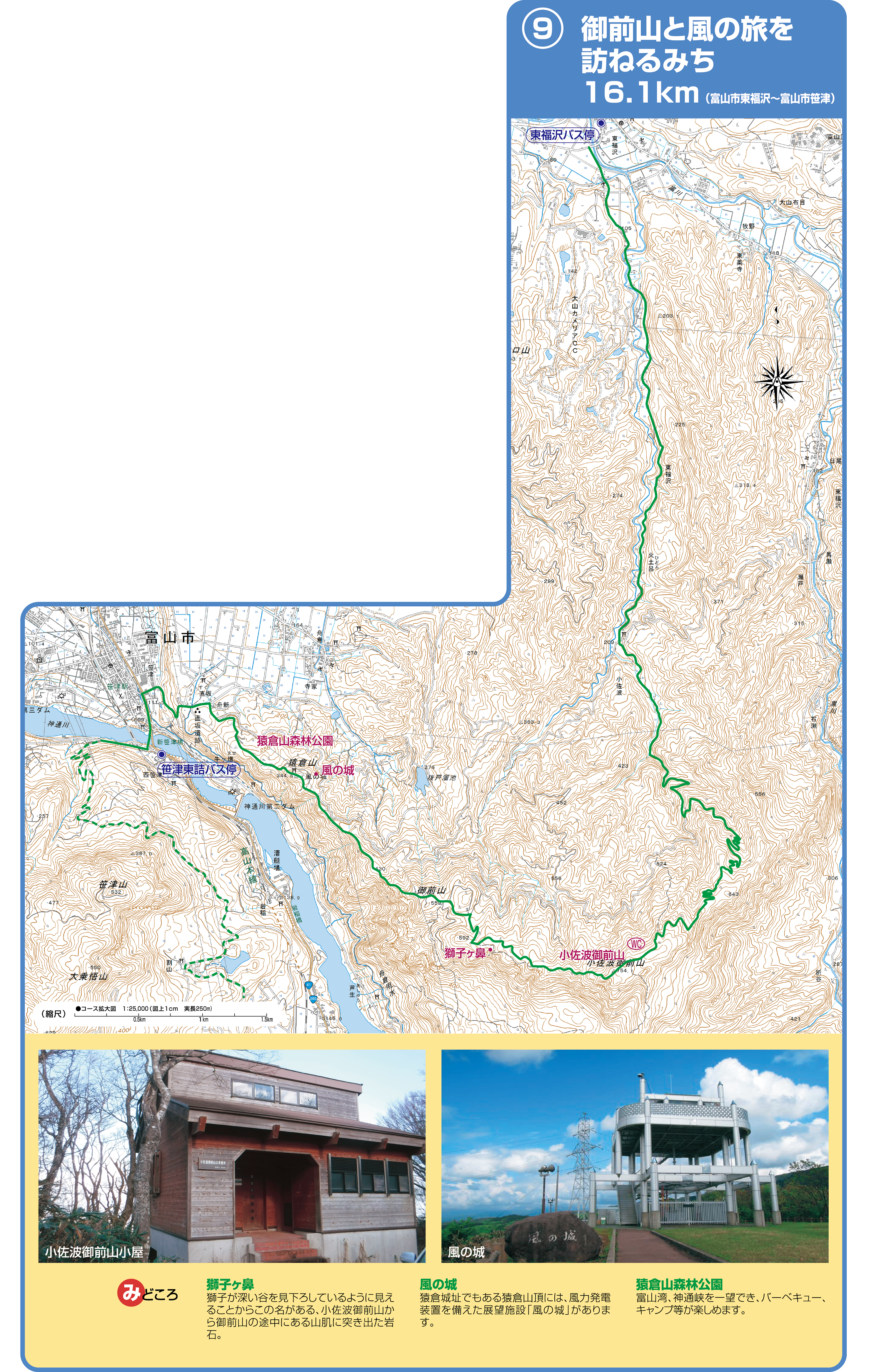 | 御前山と風の城を訪ねるみち | 16.1 | 富山市東福沢 | 富山市西笹津 | 小佐波御前山、風の城、猿倉山森林公園 |