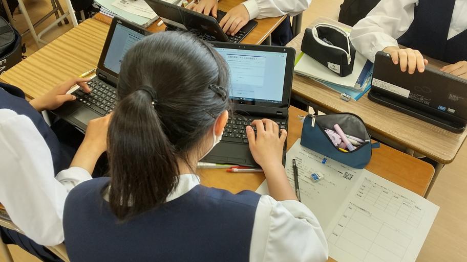 また、タブレット端末で意見を共有したり共同で資料を作成したりしています。多様な考えを基に議論を行うことで、「思考力・判断力・表現力の向上」につながっています。