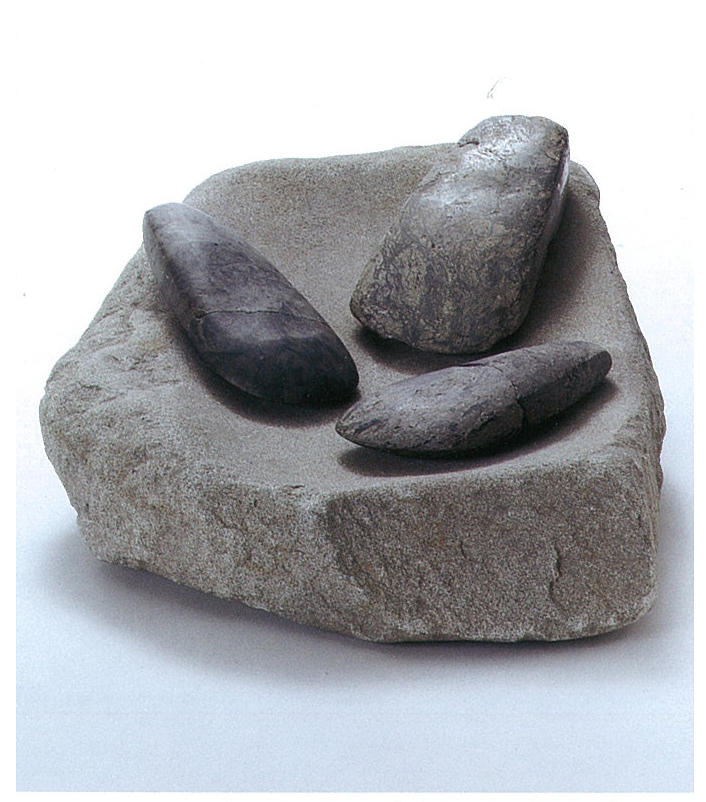 遺跡からは35,000点にも及ぶ大量の蛇紋岩製磨製石斧の未成品と加工道具が出土しています。この量は一集落での使用量をはるかに超えており、作られた磨製石斧の多くが、北は青森県から南は和歌山県まで、全国各地の遺跡から出土しており、縄文時代における地域特産品ともいうべきものが広い範囲で流通していた実態を明らかにしました。