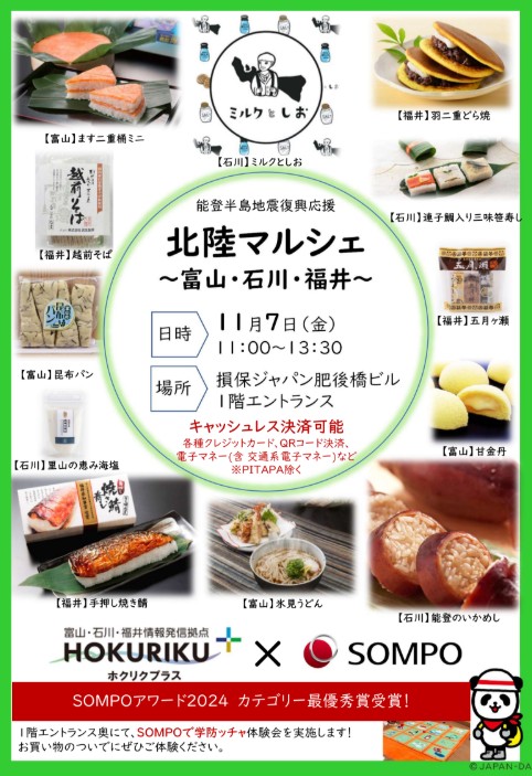 富山県では、富山・石川・福井情報発信拠点「HOKURIKU+」の認知度向上と、震災復興を祈念し、このたび、本県と包括連携協定を締結している損保ジャパン肥後橋ビルにおいて、観光物産展「能登半島地震復興応援北陸マルシェ」を開催しますのでお知らせします。