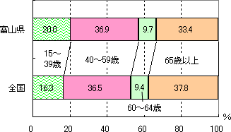 富山県の場合、販売農家の農業従事者のうち、65歳以上の占める割合は全国よりも低くなっているが、販売農家の農業就業人口のうち、65歳以上の占める割合は全国より高くなっている。これは、高い兼業農家率が主な理由と考えられる。