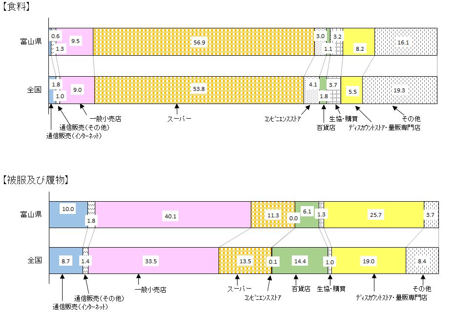 富山市の1世帯当たりの支出金額をみると、「ぶり」、「いか」、「魚介の漬物(みそ漬、昆布締め等)」及び「こんぶ」などが全国1位となっています。また、「冷凍調理食品」や「そうざい材料セット」など、調理食品への支出も多くなっています。