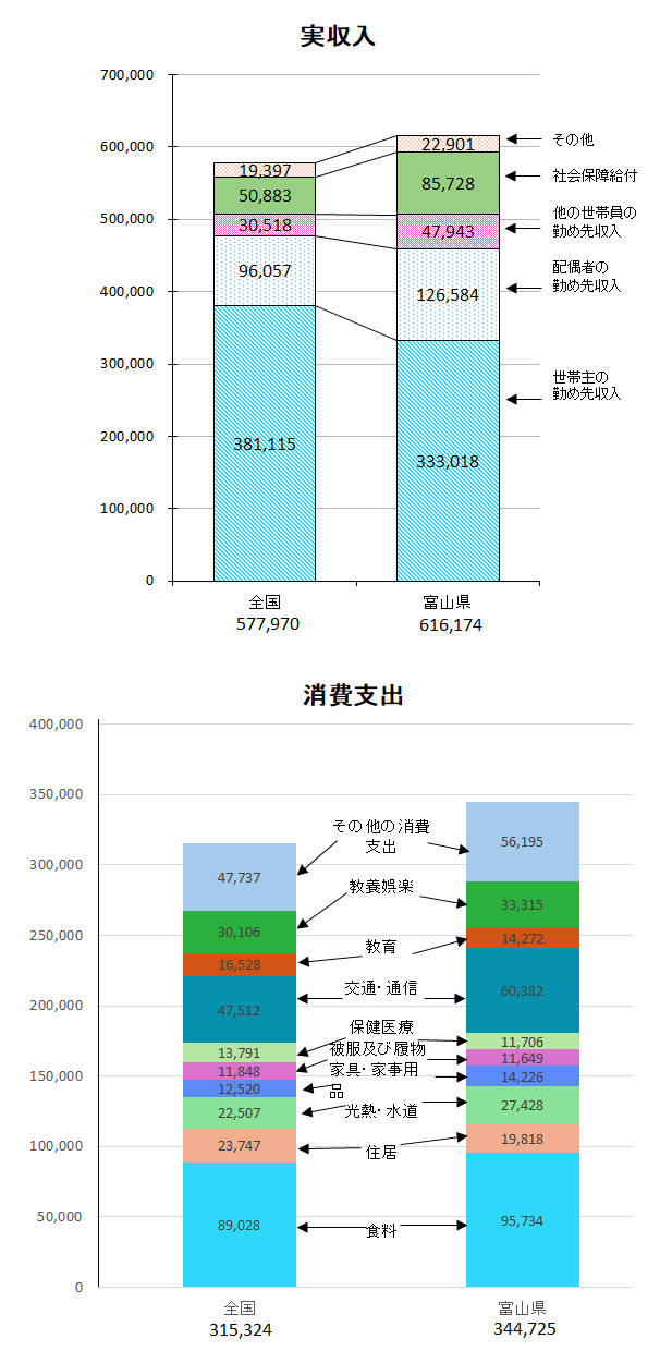 富山市の勤労者世帯(二人以上の世帯)の「実収入」は、1世帯当たり1か月平均700,638円、「可処分所得」は579,772円で、全国上位となっています。