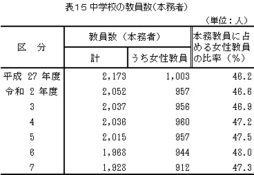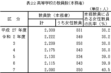 教員数(本務者)は 1,928 人(男性 1,016 人、女性 912 人)で、前年度より 40 人減少し、教員数(本務者)のうち、女性教員の占める比率は 47.3 %で、前年度より 0.7 ポイント減少している。