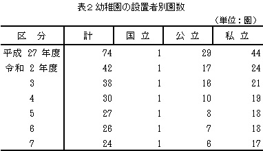 幼稚園数は 24 園(国立 1 園、公立 6 園、私立 17 園)で、前年度より 2 園減少している。