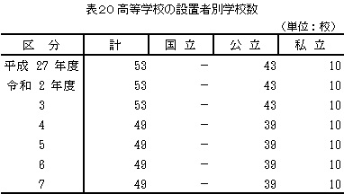 学校数は 20 校(公立 3 校、私立 17 校)で、前年度より 1 校減少している。