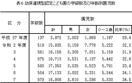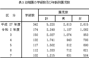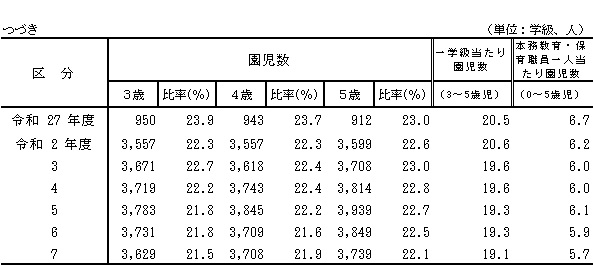 @園児数を年齢別にみると、0〜2歳児 5,830 人(全園児数の 34.5 %)、3歳児 3,629 人(全園児数の 21.5 %)、4歳児 3,708 人(同 21.9 %)、5歳児 3,739 人(同 22.1 %)である。