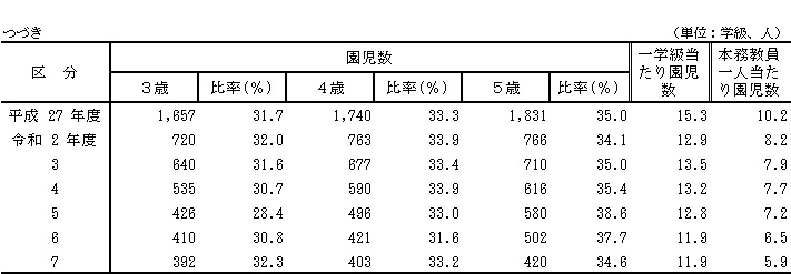A一学級当たりの園児数(3〜5歳児)は 19.1 人で、前年度より 0.2 人減少している。
