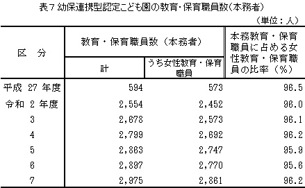 教育・保育職員数(本務者)は 2,975 人(男性 114 人、女性 2,861 人)で、前年度より 78 人増加し、教育・保育職員(本務者)のうち、女性教育・保育職員の占める比率は 96.2 %である。