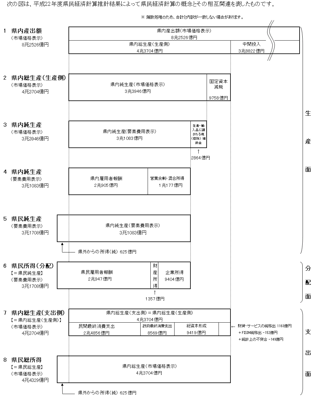 県民経済計算とは、本県の1年間(年度)の経済活動の結果を、生産・分配・支出の三面から 総合的・体系的にとらえ、県経済の規模や成長率、さらには産業構造などを明らかにしたものである。