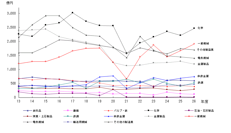 化学は、医薬品の受託製造や後発医薬品の増加などにより10.9%増加し、県内総生産に占める割合が5.5%と、製造業の中では最も大きかった。電気機械は、輸出用電子部品の減少などにより3.6%減少した。一般機械は、海外向け工作機械、自動車部品関連の需要増などにより14.5%増加した。非鉄金属は、アルミニウム再生地金やアルミニウム合金の増加などにより8.1%増加した。鉄鋼は、工作機械や自動車向けの増加などにより29.8%増加した。