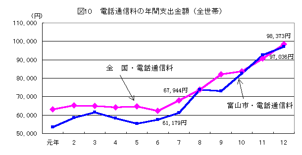携帯電話やPHS、インターネットが急速に普及したことなどにより、電話通信料が年々増加している。富山市においても全国同様増加しており、5年前(平成7年)と比べると、1.6倍となっている。また、電話通信料の32.8%が 移動電話通信料で、全国の29.0%を上回っている。(図10)