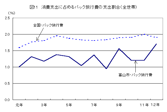 しかし、平成12年はサービスで大きな割合を占めるパック旅行の支出が大きく伸びたこと、また、衛星放送や、ケーブルテレビなどの放送受信料、パソコンの接続料を含む他の娯楽サービスが堅調に伸びたことにより、サービスの支出割合を伸ばした。