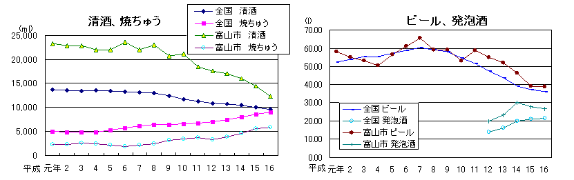 富山市の酒類への支出金額は清酒(12,511円、全国4位)、ビール(19,420円、16位)、発泡酒(9,410円、7位)では全国平均を上回るが、焼ちゅう(4、178円、39位)、ワイン(2,398円、27位)では全国平均を下回る。