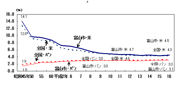 しかし、ここ数年は米、パンとも概ね同水準で推移し、平成16年は、米4.5%、パン3.1%となった。(全国平均:米4.3%、パン3.3%)