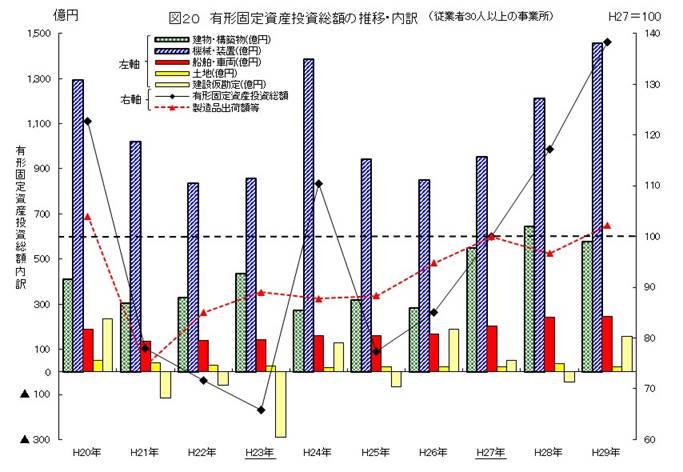 なお、有形固定資産取得額(土地を含む)及び建設仮勘定の年間増減は、設備投資などに左右され、もともと年変動が大きく、産業別増減や構成比は大きく変動する傾向がある。