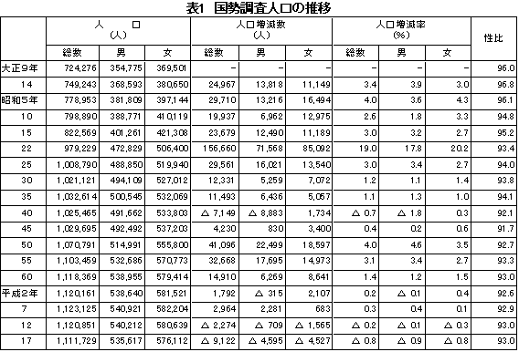 人口を男女別にみると、男性が535,617人、女性が576,112人で、女性が40,495人多く、人口性比(女性100人対する男性の数)は93.0となっています。 |
