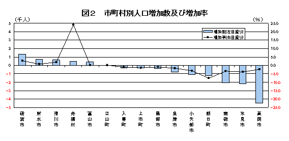人口増加数が多かったのは、砺波市1,337人、射水市706人、滑川市639人の順となっており、人口増加率では、舟橋村24.2%、砺波市2.8%、滑川市1.9%の順に高くなっています。