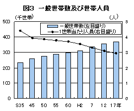 世帯の状況をみると、一般世帯数は370,230世帯で、平成12年に比べ13,869世帯、3.9%増加しており、このうち2人世帯が92,251世帯で24.9%を占め最も多くなっています。次に、世帯人員別に一般世帯数の増加率の最も高いのは1人世帯(80,770世帯)で、平成12年に比べ13.7%増加しています。また、一般世帯の1世帯あたりの人員は2.93人で平成12年と比べ0.16人減少しています。 |