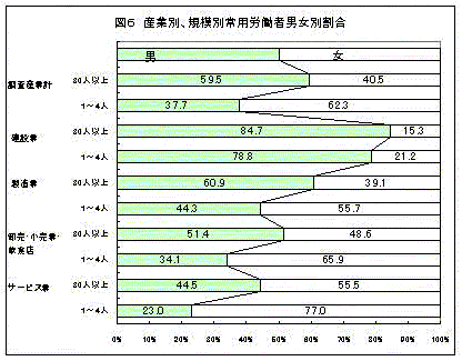 また、女子常用労働者の割合を産業別にみると、サービス業の77.0%が最も高く、次いで卸売・小売業,飲食店の65.9%となっている(図4,5,6)。