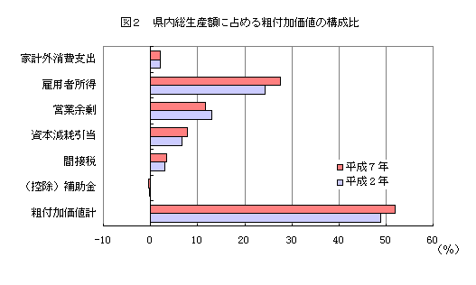 平成7年の県内生産額8兆7,635億円の投入構造をみると、その48.0%は生産に必要な原材料、燃料、事業所向けサービス等の中間投入で、残りの52.0%は生産によって新たに付け加えられた粗付加価値である。産業別にみると、製造業が62.4%と最も高く、次いで建設業(56.8%)、鉱業(50.8%)の順となっている。