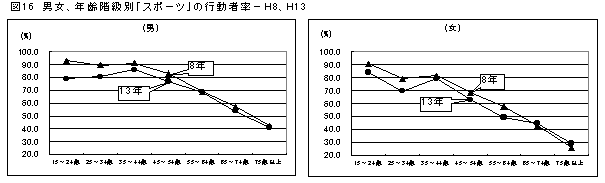 「スポーツ」の行動者率を15歳以上の年齢階級別にみると、男性は35〜44歳が85.9%、女性は15〜24歳が84.1%で最も高くなっており、以後年齢が高くなるに従っておおむね低下している。これを平成8年と比較すると、男性はすべての年齢階級で低下しており、女性も64歳以下のすべての年齢階級で低下している。特に、男性は15〜24歳、女性は25〜34歳で低下幅が最も大きく、それぞれ14.0ポイント、9.8ポイントとなっている。(図16)