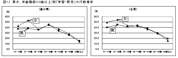 「学習・研究」の行動者率を年齢階級別にみると、65歳以上を除くすべての年齢階級で女性の方が高く、15〜24歳では、女性の方が男性より15ポイント高くなっている。(図13)