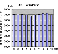 | 都道府県名 | 順 位 | 人口1人当たり 電力使用量 kWh (平成10年) | 都道府県名 | 順 位 | 人口1人当たり 電力使用量 kWh (平成10年) | | 滋賀 | 1 | 7,256 | 神奈川 | 24 | 4,118 | | 富山 | 2 | 6,923 | 広島 | 25 | 4,116 | | 栃木 | 3 | 6,192 | 佐賀 | 26 | 4,113 | | 愛知 | 4 | 6,179 | 千葉 | 27 | 3,969 | | 福井 | 5 | 5,983 | 宮城 | 28 | 3,867 | | 静岡 | 6 | 5,911 | 愛媛 | 29 | 3,838 | | 三重 | 7 | 5,884 | 秋田 | 30 | 3,828 | | 茨城 | 8 | 5,847 | 福岡 | 31 | 3,813 | | 群馬 | 9 | 5,794 | 京都 | 32 | 3,804 | | 岡山 | 10 | 5,540 | 山形 | 33 | 3,725 | | 山口 | 11 | 5,308 | 岩手 | 34 | 3,677 | | 兵庫 | 12 | 4,898 | 和歌山 | 35 | 3,672 | | 岐阜 | 13 | 4,818 | 鳥取 | 36 | 3,533 | | 大阪 | 14 | 4,658 | 島根 | 37 | 3,531 | | 香川 | 15 | 4,619 | 宮崎 | 38 | 3,507 | | 長野 | 16 | 4,589 | 熊本 | 39 | 3,503 | | 山梨 | 17 | 4,582 | 青森 | 40 | 3,425 | | 石川 | 18 | 4,440 | 埼玉 | 41 | 3,388 | | 全国平均 | | 4,412 | 高知 | 42 | 3,277 | | 徳島 | 19 | 4,347 | 奈良 | 43 | 3,129 | | 東京 | 20 | 4,290 | 沖縄 | 44 | 3,093 | | 新潟 | 21 | 4,242 | 鹿児島 | 45 | 3,080 | | 大分 | 22 | 4,209 | 北海道 | 46 | 2,958 | | 福島 | 23 | 4,136 | 長崎 | 47 | 2,692 |