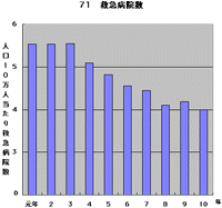 | 都道府県名 | 順 位 | 人口10万人当たり 救急病院数 ヵ所 (平成10年) | 都道府県名 | 順 位 | 人口10万人当たり 救急病院数 ヵ所 (平成10年) | | 福井 | 1 | 7.11 | 京都 | 25 | 3.72 | | 香川 | 2 | 6.32 | 岐阜 | 26 | 3.69 | | 佐賀 | 3 | 6.10 | 三重 | 27 | 3.61 | | 和歌山 | 4 | 5.57 | 栃木 | 28 | 3.55 | | 高知 | 5 | 5.29 | 鳥取 | 29 | 3.42 | | 石川 | 6 | 4.98 | 全国平均 | | 3.39 | | 鹿児島 | 7 | 4.85 | 東京 | 30 | 3.14 | | 北海道 | 8 | 4.81 | 愛知 | 31 | 3.12 | | 岡山 | 8 | 4.81 | 島根 | 31 | 3.12 | | 徳島 | 8 | 4.81 | 兵庫 | 33 | 3.11 | | 宮崎 | 11 | 4.76 | 埼玉 | 34 | 3.05 | | 山口 | 12 | 4.59 | 山形 | 35 | 3.03 | | 熊本 | 13 | 4.45 | 秋田 | 36 | 2.82 | | 広島 | 14 | 4.44 | 大阪 | 37 | 2.81 | | 岩手 | 15 | 4.30 | 新潟 | 38 | 2.77 | | 長野 | 16 | 4.29 | 福島 | 39 | 2.76 | | 群馬 | 17 | 4.06 | 福岡 | 40 | 2.56 | | 富山 | 18 | 4.00 | 奈良 | 41 | 2.49 | | 山梨 | 19 | 3.94 | 宮城 | 42 | 2.47 | | 愛媛 | 20 | 3.92 | 静岡 | 43 | 2.42 | | 長崎 | 21 | 3.91 | 千葉 | 44 | 2.38 | | 大分 | 21 | 3.91 | 神奈川 | 45 | 2.23 | | 青森 | 23 | 3.78 | 滋賀 | 46 | 2.14 | | 茨城 | 24 | 3.75 | 沖縄 | 47 | 1.63 |