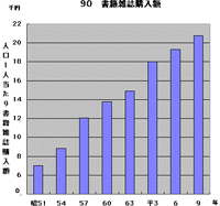 | 都道府県名 | 順 位 | 人口1人当たり 書籍雑誌購入額 円 (平成9年) | 都道府県名 | 順 位 | 人口1人当たり 書籍雑誌購入額 円 (平成9年) | | 東京 | 1 | 34,611 | 長野 | 24 | 16,948 | | 京都 | 2 | 25,488 | 三重 | 25 | 16,890 | | 石川 | 3 | 23,703 | 茨城 | 26 | 16,844 | | 大阪 | 4 | 23,584 | 山口 | 27 | 16,805 | | 鳥取 | 5 | 22,504 | 静岡 | 28 | 16,448 | | 福岡 | 6 | 21,081 | 宮崎 | 29 | 16,334 | | 愛知 | 7 | 20,809 | 千葉 | 30 | 16,318 | | 富山 | 8 | 20,769 | 山形 | 31 | 16,246 | | 群馬 | 9 | 20,701 | 岩手 | 32 | 16,112 | | 岡山 | 10 | 20,218 | 高知 | 33 | 15,767 | | 宮城 | 11 | 19,899 | 埼玉 | 34 | 15,691 | | 全国平均 | | 19,647 | 山梨 | 35 | 15,517 | | 広島 | 12 | 19,422 | 栃木 | 36 | 15,278 | | 福井 | 13 | 19,170 | 長崎 | 36 | 15,278 | | 大分 | 14 | 18,989 | 福島 | 38 | 14,920 | | 徳島 | 15 | 18,919 | 秋田 | 39 | 14,893 | | 神奈川 | 16 | 18,823 | 島根 | 40 | 14,801 | | 香川 | 17 | 18,504 | 鹿児島 | 41 | 14,769 | | 新潟 | 18 | 17,990 | 沖縄 | 42 | 13,236 | | 青森 | 19 | 17,853 | 熊本 | 43 | 13,021 | | 兵庫 | 20 | 17,601 | 和歌山 | 44 | 12,709 | | 岐阜 | 21 | 17,363 | 佐賀 | 45 | 12,558 | | 北海道 | 22 | 17,239 | 滋賀 | 46 | 11,686 | | 愛媛 | 23 | 17,208 | 奈良 | 47 | 11,372 |