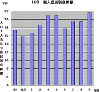 | 都道府県名 | 順 位 | 人口1人当たり 個人県民税負担額 円 (平成9年度) | 都道府県名 | 順 位 | 人口1人当たり 個人県民税負担額 円 (平成9年度) | | 東京 | 1 | 34,447 | 山梨 | 24 | 18,850 | | 神奈川 | 2 | 30,334 | 岡山 | 25 | 18,831 | | 千葉 | 3 | 26,053 | 福岡 | 26 | 18,290 | | 愛知 | 4 | 25,700 | 山口 | 27 | 17,972 | | 埼玉 | 5 | 24,951 | 新潟 | 28 | 17,734 | | 大阪 | 6 | 24,205 | 北海道 | 29 | 17,693 | | 静岡 | 7 | 23,732 | 和歌山 | 30 | 17,019 | | 奈良 | 8 | 23,668 | 鳥取 | 31 | 16,372 | | 兵庫 | 9 | 23,407 | 徳島 | 32 | 16,320 | | 京都 | 10 | 22,734 | 福島 | 33 | 16,289 | | 全国平均 | | 22,358 | 山形 | 34 | 16,026 | | 三重 | 11 | 21,548 | 島根 | 35 | 15,981 | | 富山 | 12 | 21,523 | 高知 | 36 | 15,548 | | 滋賀 | 13 | 21,182 | 愛媛 | 37 | 15,459 | | 広島 | 14 | 21,133 | 大分 | 38 | 15,147 | | 福井 | 15 | 20,779 | 佐賀 | 39 | 15,065 | | 石川 | 16 | 20,768 | 岩手 | 40 | 15,006 | | 岐阜 | 17 | 20,547 | 長崎 | 41 | 14,785 | | 茨城 | 18 | 19,950 | 秋田 | 42 | 14,490 | | 長野 | 19 | 19,640 | 熊本 | 43 | 14,415 | | 栃木 | 20 | 19,597 | 青森 | 44 | 14,230 | | 香川 | 21 | 19,427 | 宮崎 | 45 | 13,395 | | 群馬 | 22 | 19,152 | 鹿児島 | 46 | 13,118 | | 宮城 | 23 | 18,860 | 沖縄 | 47 | 11,258 |