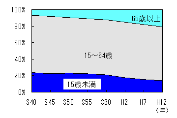 年齢3区分別人口割合でみると、年少人口(15歳未満)13.6%(151,579人)、生産年齢人口(15〜64歳)63.7%(711,089人)、老年人口(65歳以上)22.7%(253,240人)となっている。平成5年に初めて老年人口が年少人口を1.0ポイント上回ったが、平成16年では9.1ポイント上回っている。