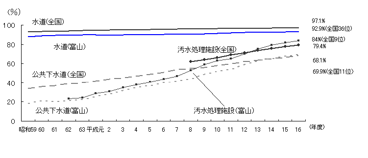 水道・公共下水道普及率・汚水処理人口普及率 資料出所:富山県食品生活衛生課・下水道課 |