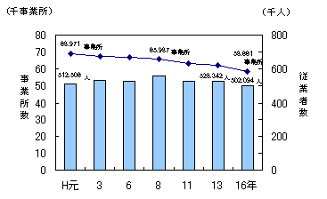 ≪事業所≫平成16年における本県の事業所数は、平成13年比5.5%減(3,413事業所)の58,661事業所と、3年調査以降減少が続いている。従業者数は、同比5.0%減(26,248人)の502,094人で、11年調査以降減少し、元年調査の数値を下回った。