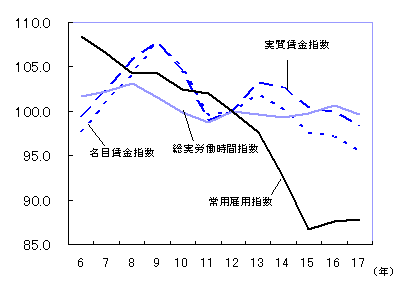 毎月勤労統計調査で見ると、平成17年の規模30人以上の常用雇用指数(平成12年を100)は、前年比0.2%増の87.8となった。また、実質賃金指数は1.7%減の98.3、総実労働時間指数は1.0%減の99.6となった。