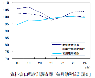 毎月勤労統計調査で見ると、平成24年の規模30人以上の常用雇用指数(平成22年を100)は、前年比0.6%減の99.5となった。また、実質賃金指数は、前年比0.4%増の103.7、総実労働時間指数は0.7%減の100.0となった。